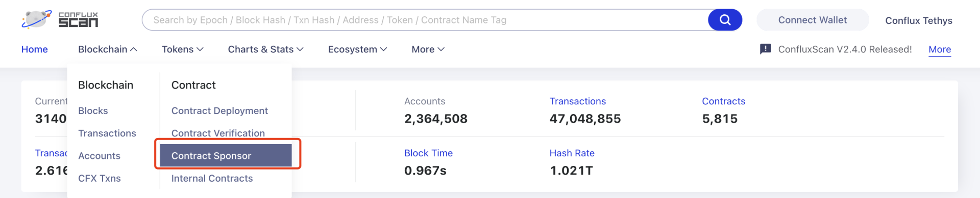 - Click on "Blockchain", select "Sponsorship Contracts" under "Contracts" column and enter the sponsorship contract interface