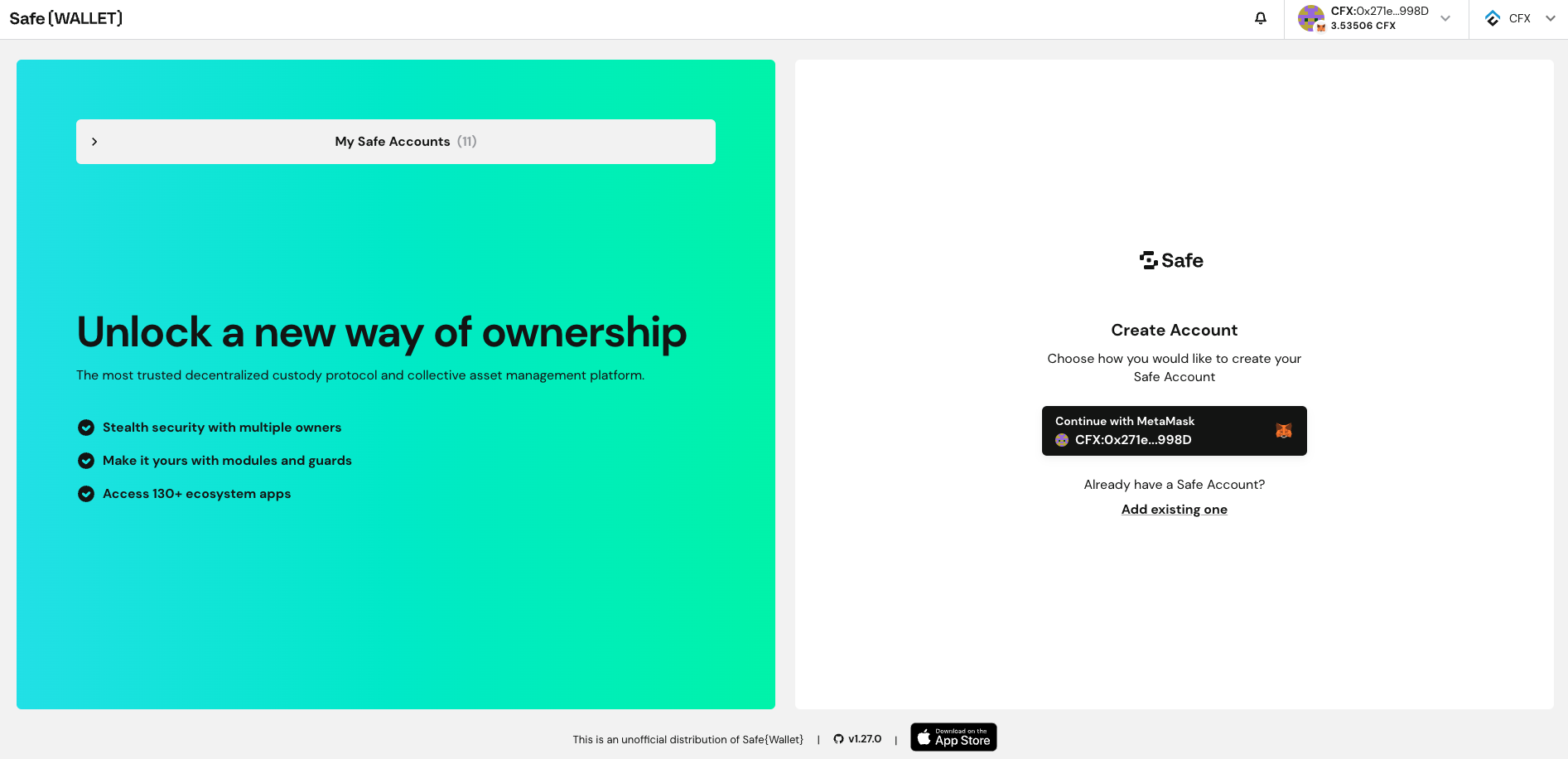 To support developers and DeFi projects within the eSpace ecosystem, eSpace has incorporated the Gnosis Safe Wallet into its infrastructure. Versions 1.3.0 and 1.4.1 of the Safe contract have been deployed on both the eSpace mainnet and testnet, with their address can be found in the changelog. For mainnet users, a dedicated Safe-Wallet-Web frontend is available, enabling the creation and management of multisignature accounts for CFX and ERC20 tokens.