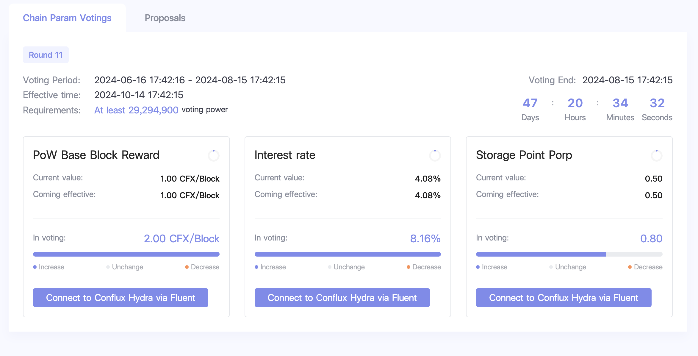 Conflux uses a decentralized autonomous organization (DAO) to control key parameters affecting token distribution and burning. The DAO vote is managed by the Conflux internal contract ParamsControl. A frontend panel is available for on-chain DAO voting.