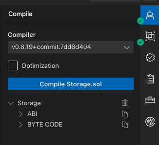 右侧工具箱中的第一个选项是 Solidity 编译器。 您可以在这里选择编译器版本,然后点击“编译”按钮来编译您的合约。