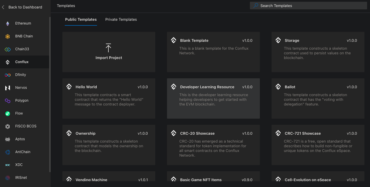 首先,在 ChainIDE 上创建一个项目。 在左侧的链列表里选中 Conflux,然后从右侧选择一个模板。 在本教程中,我们将使用 Storage 模板。