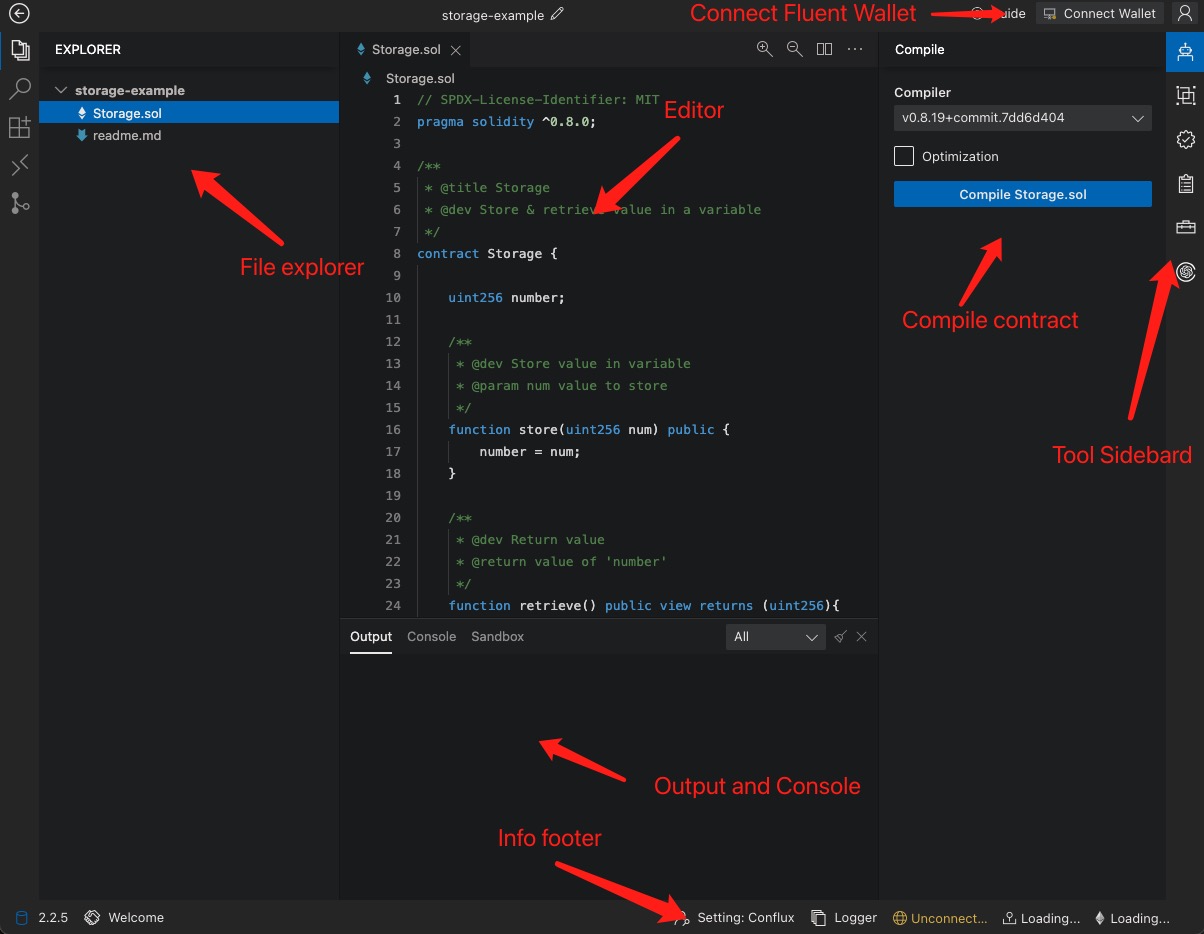 在将此合约部署到 Core Space 测试网之前,需要先连接您的 Fluent 钱包。 点击窗口右上角的连接钱包按钮。