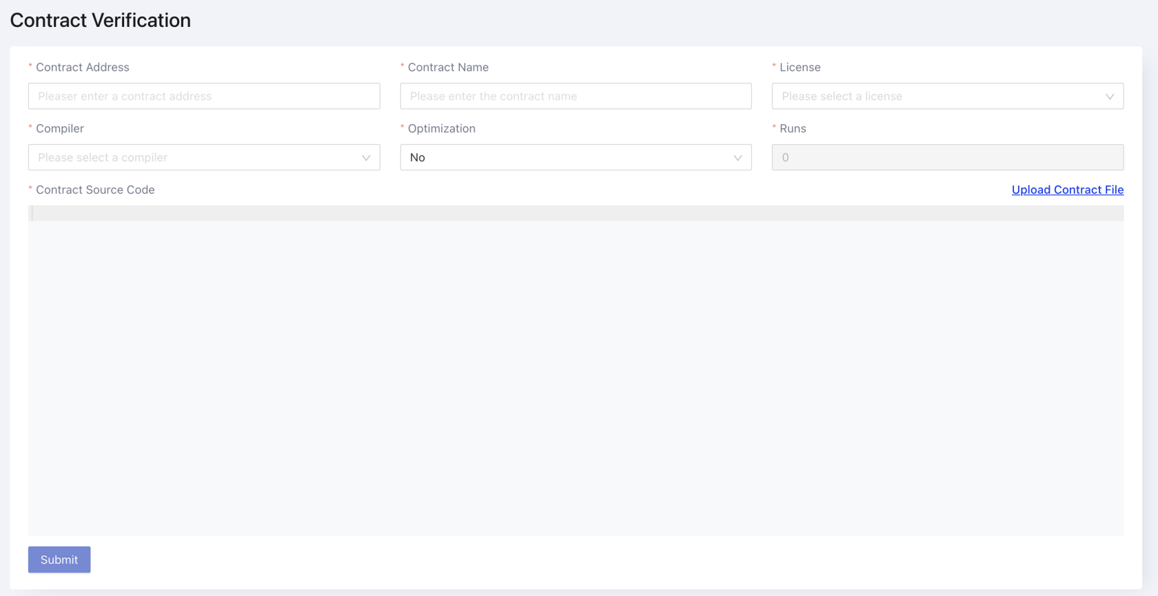 开发者可以使用 flatten 工具(hardhat、foundry)将合约及其依赖合并为一个文件。 然后将合并后的代码复制到编辑器中。 填写合约名称、编译器版本以及许可证。 最后,点击提交按钮验证合约。